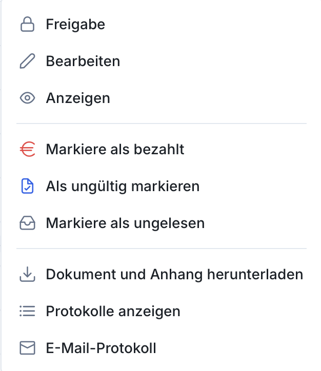 Kontext-Menüs: Über neue Dropdown-Menüs direkt in der Zeile haben Sie sofortigen Zugriff auf alle wichtigen Aktionen (Anzeigen, Bearbeiten, Senden).